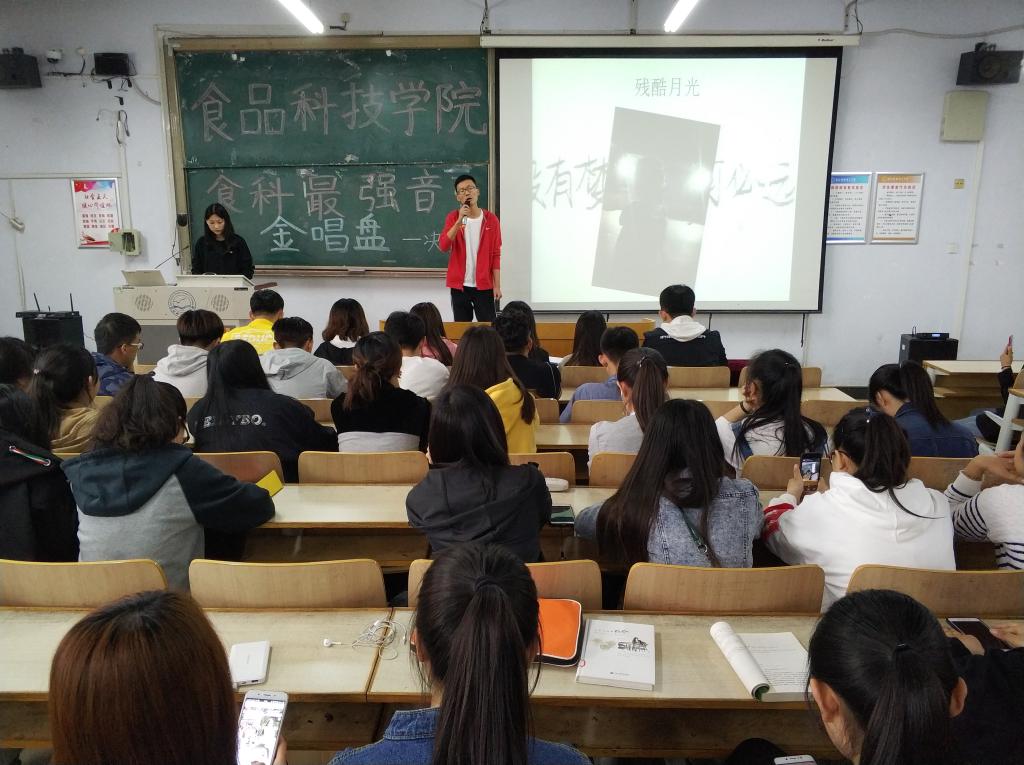 为了丰富同学们的课余文化生活,激发同学们的音乐热情。食品科技学院于2018年4月3日晚上19:00,在c110举办了“金唱盘”歌手大赛。