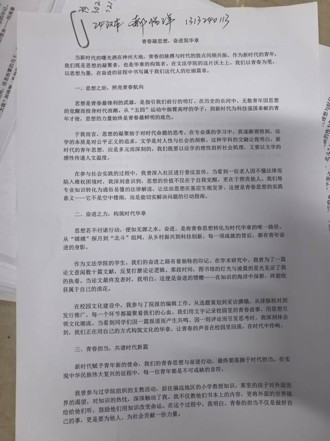 本次“青春凝思想,奋进筑华章”心得分享征文活动的成功举办,取得了显著的育人成效与广泛反响。活动不仅为文法学子搭建了一个展示文学才华、交流思想感悟的宝贵平台,有效锻炼和提升了学生的文字组织能力与逻辑表达水平,更是一次深刻的思想引领与精神动员。它使“奋斗的青春最美丽”的理念更加深入人心,激励着广大同学在今后的学习与生活中,自觉将个人成长融入国家发展伟业,以青春之我、奋斗之我,为民族复兴铺路架桥,为祖国建设添砖加瓦,为实现中华民族伟大复兴的中国梦贡献属于自己的青春智慧和力量。(作者:王丹 编辑:张佳琪 审核:乔潇)