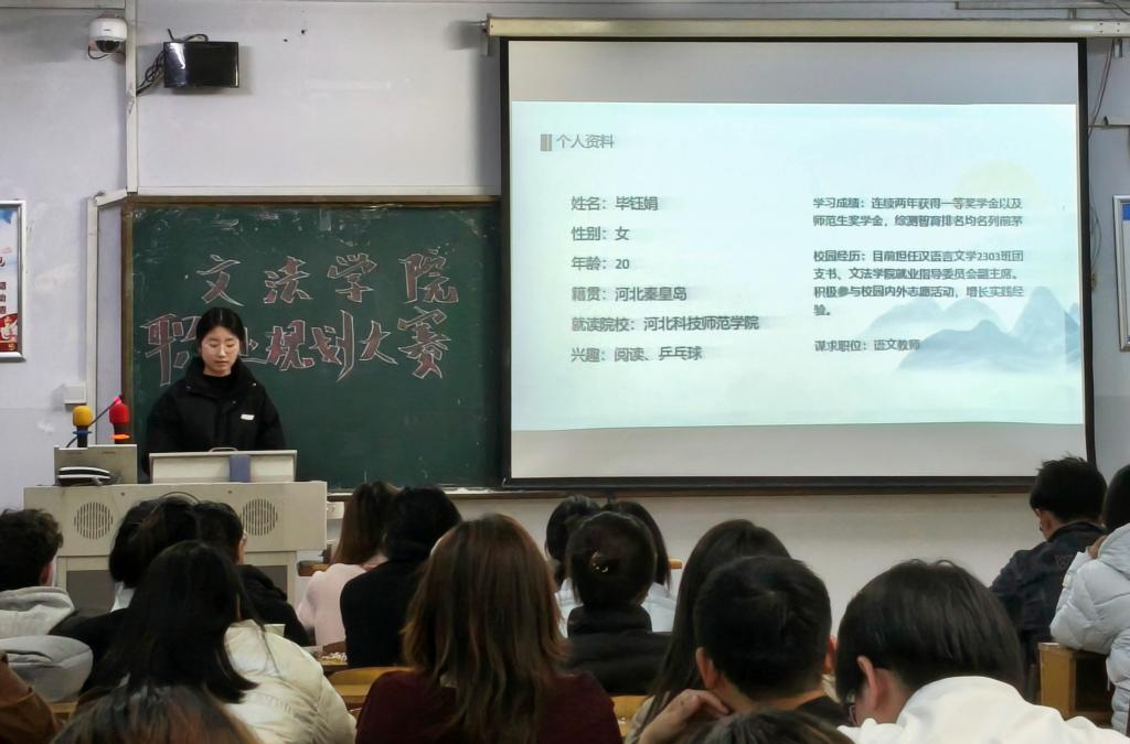 为提升学生自我认知能力,激发学生对未来职业的主动探索意识,引导学生明确自身核心优势与发展短板,搭建职场认知桥梁,文法学院团委于2025年11月10日在综合楼604举办职业规划大赛。本次大赛面向学院不同年级学生,分成长、就业赛道开展,吸引众多学生参与。