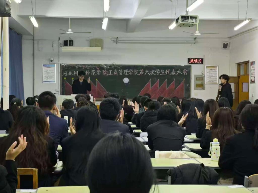 2025年11月29日,工商管理学院第六次学生代表大会在庄严隆重的氛围中顺利举行。学院党委副书记、团委书记与74名学生代表齐聚一堂,共同参与了此次会议。