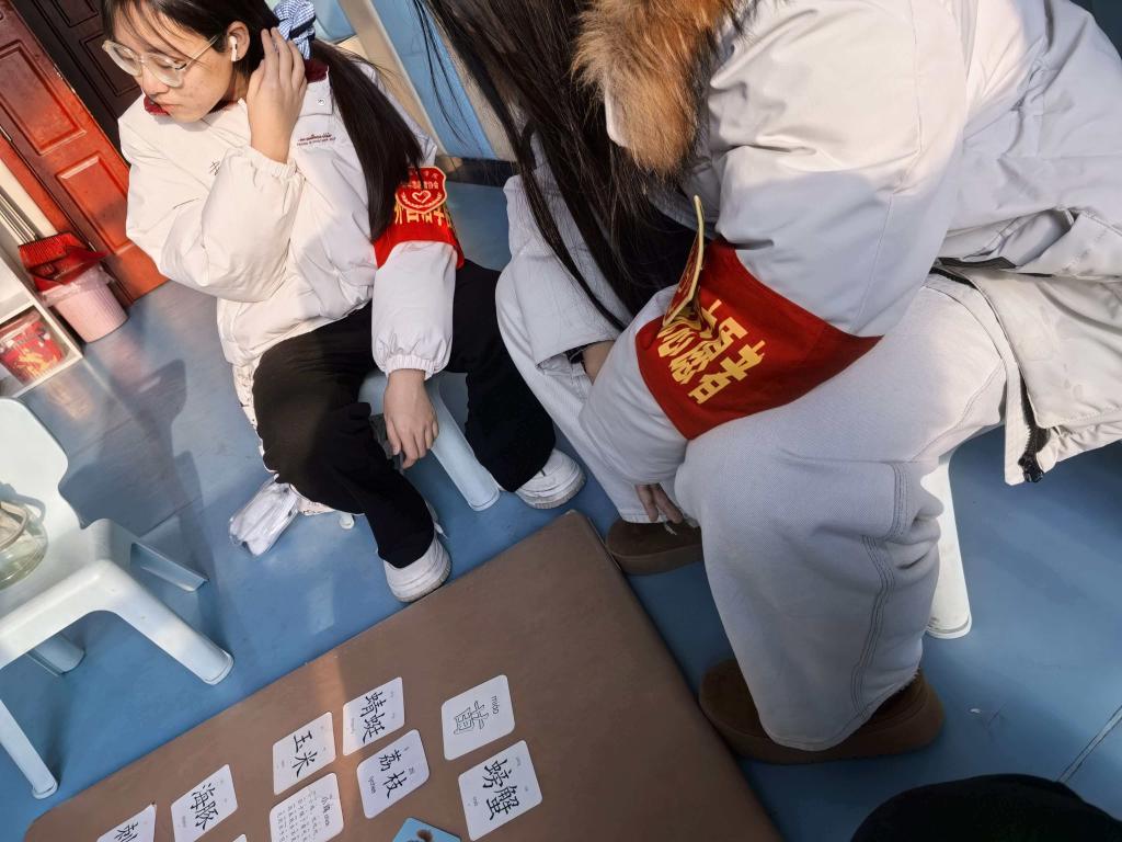 活动现场两名志愿者佩戴带有“外国语学院”标志的袖章。暖阳透过窗棂洒满屋子, 志愿者们将散落的彩珠、丝线一一归整,又把那些缀着流苏、闪着微光的成品手串轻轻捧起。他们俯下身,小心翼翼地拉开玻璃的抽屉,将这些满载着心意的手串整齐排列好,指尖掠过光滑的柜面时,似是怕惊扰了这份藏在手串里的温柔。他们细心地将手串一一摆齐,不让丝线勾连,不让流苏凌乱,关柜门的瞬间,仿佛将满室的温暖与欢喜,都妥帖地收藏在了这一方小小的天地里。另一侧的角落,识字卡被一张张铺展。志愿者的声音温柔而清晰,指着卡片上的汉字,逐字逐句地讲解。孩子们的目光紧紧追随着卡片上的笔画,小脑袋随着讲解轻轻晃动,偶尔举起小手,怯生生又认真地跟读。阳光里,墨色的字迹与孩子们澄澈的眼神相映,志愿者一遍遍重复着读音,孩子们的跟读声越来越响亮,小小的活动室里,满是童真与暖意交织的气息,这一画面成了助残活动中最动人的风景。