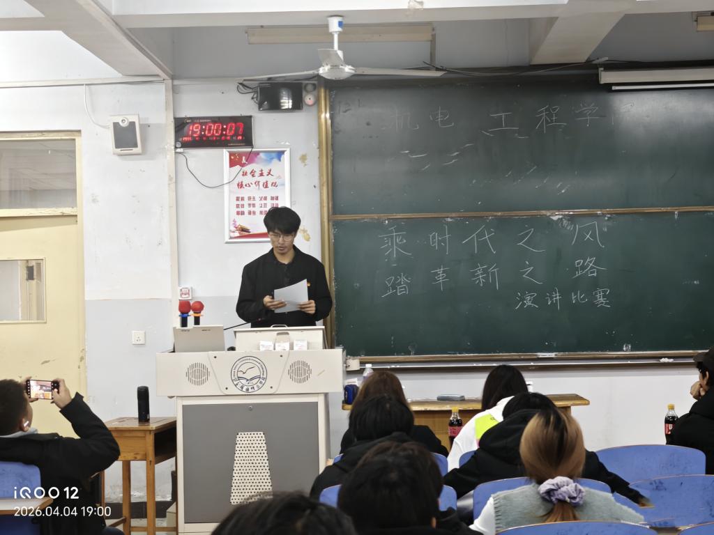 2026年4月4日,机电工程学院在开发区Z118教室举办“乘时代之风,踏革新之路”主题演讲比赛,共有89名同学参加了比赛。